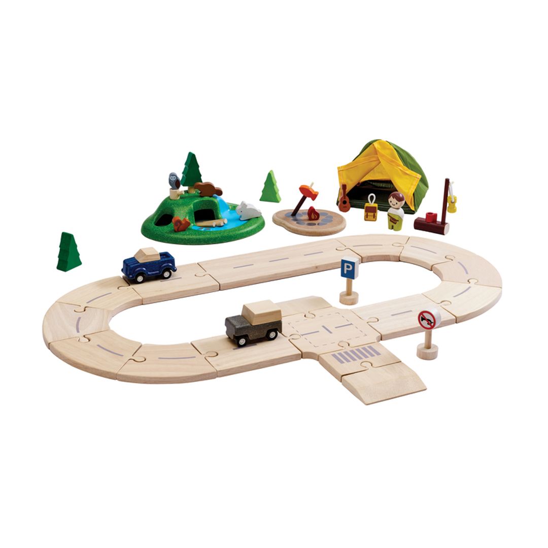 - The set includes 47 pieces wooden road tracks vehicles explorer accessories camping gear and forest animals