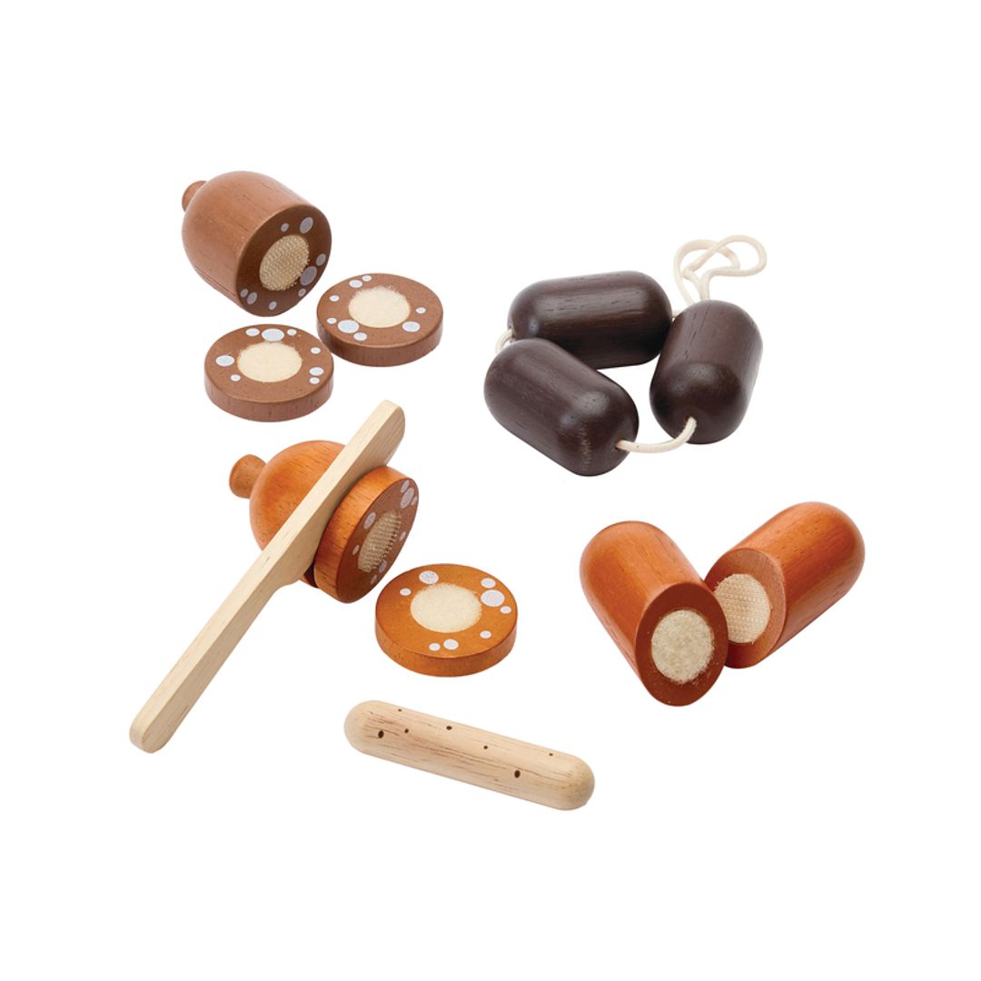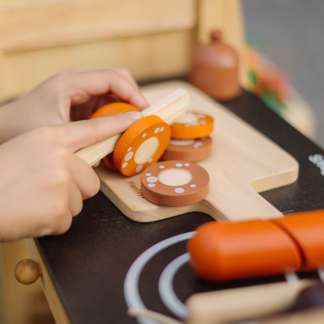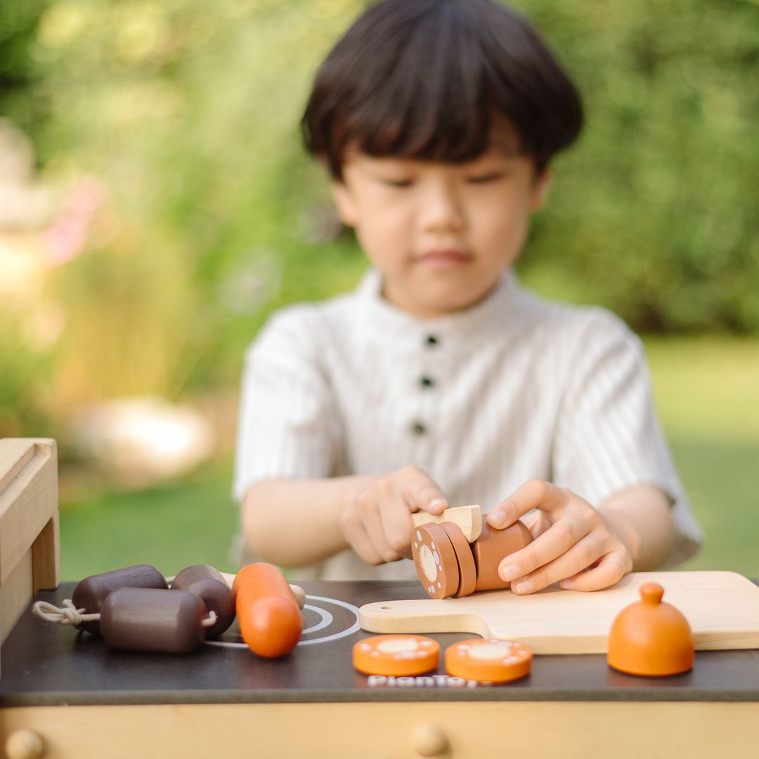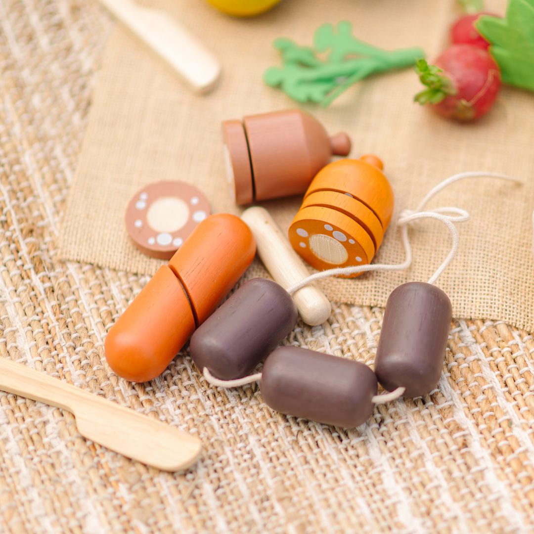 - Develops fine motor skills and hand eye coordination through slicing serving and sharing wooden sausages
